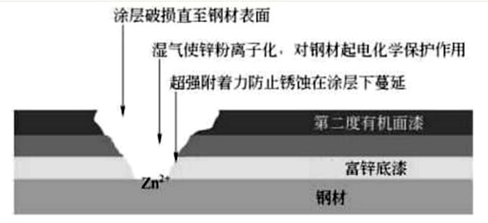 規(guī)定比較高的鋅粉含量,是因?yàn)楸┞对诟g環(huán)境中的鋼材,如果富鋅底漆中鋅含量低,那么顆粒鋅粉就不能形成完整的鋅粉層 ,固化了的環(huán)氧樹脂導(dǎo)電性差,大大妨礙了鋅粉的化學(xué)保護(hù)作用,影響了環(huán)氧富鋅底漆對(duì)鋼的陰極保護(hù)作用。因此,具有一定高的鋅含量是保證富鋅底漆防 腐性能的一項(xiàng)很重要的技術(shù)指標(biāo)。